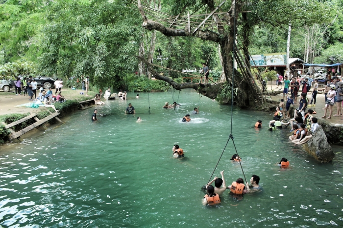 Dans votre circuit au Laos en famille, À quelques kilomètres du centre, le Blue Lagoon est un endroit parfait pour se rafraîchir, nager ou pique-niquer en famille. Les plus jeunes peuvent s’amuser dans l’eau, pendant que les adultes se détendent à l’ombre des arbres. Vang Vieng est donc une belle étape pour profiter de la nature laotienne, dans un cadre simple, accessible et adapté à toute la famille.