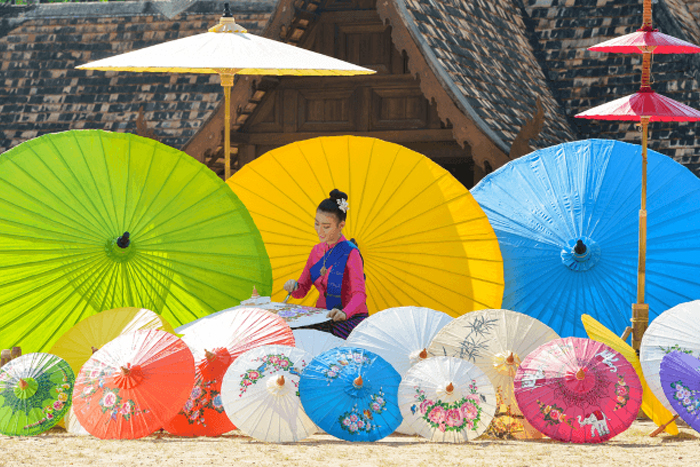 À 15h15, poursuivez avec une immersion dans l’artisanat local. Dirigez-vous à l’est de la ville vers le village artisanal de Bo Sang, à environ 20 minutes. Ce village charmant est mondialement connu pour ses ombrelles en papier peintes à la main, mais aussi pour ses soieries, laques et bijoux en argent. Observez les artisans à l’œuvre, parcourez les échoppes familiales et pourquoi pas, peignez votre propre ombrelle – un souvenir unique et créatif.