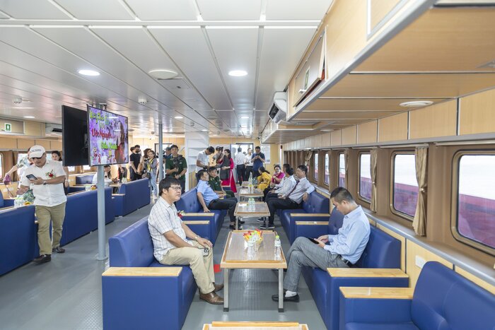 Le navire à grande vitesse présente une proue inversée allongée, conçue pour assurer une navigation fluide à travers des zones maritimes sujettes aux vents contraires, comme Vung Tau - Con Dao. De plus, il est équipé d'un système audio et vidéo conforme aux normes techniques nationales pour la classification et la construction de navires à grande vitesse. Ces spécifications répondent aux normes établies par l'Organisation maritime internationale (OMI), garantissant un voyage maritime sûr et conforme.